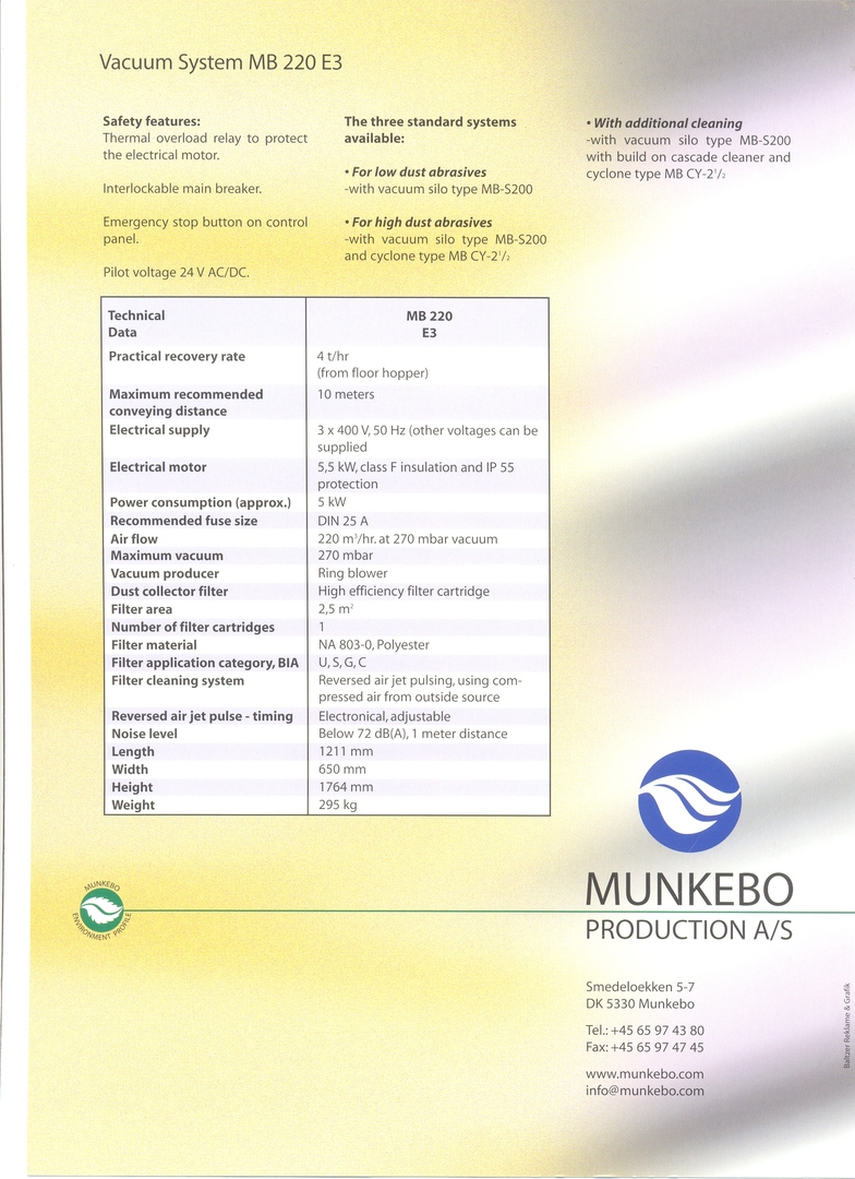 MB 220-E3 ir kompakta vakuuma ierīce atstrādāto abrazīvu attīrīšanai un savākšanai
